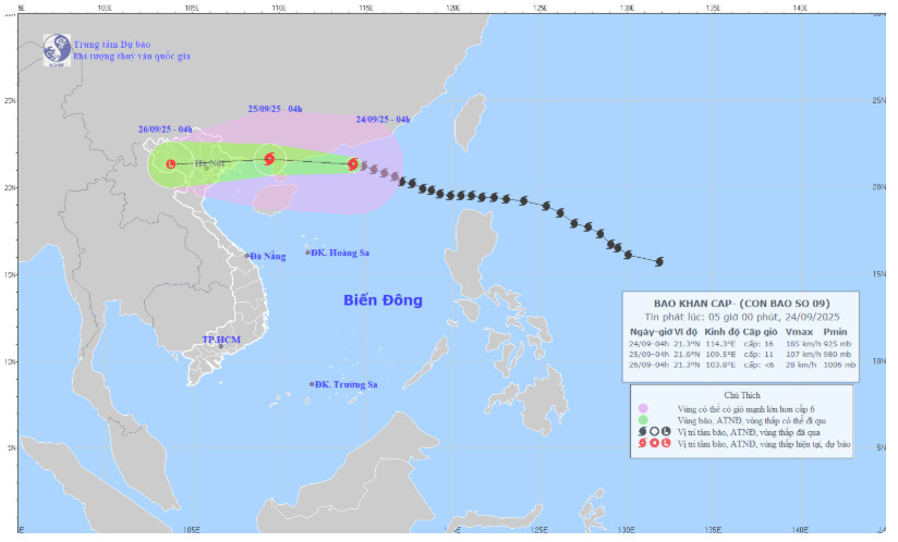 Bản đồ dự báo quỹ đạo và cường độ bão số 9 phát lúc 4h00 ngày 24/9/2025. Ảnh: Trung tâm Dự báo Khí tượng Thủy văn Quốc gia